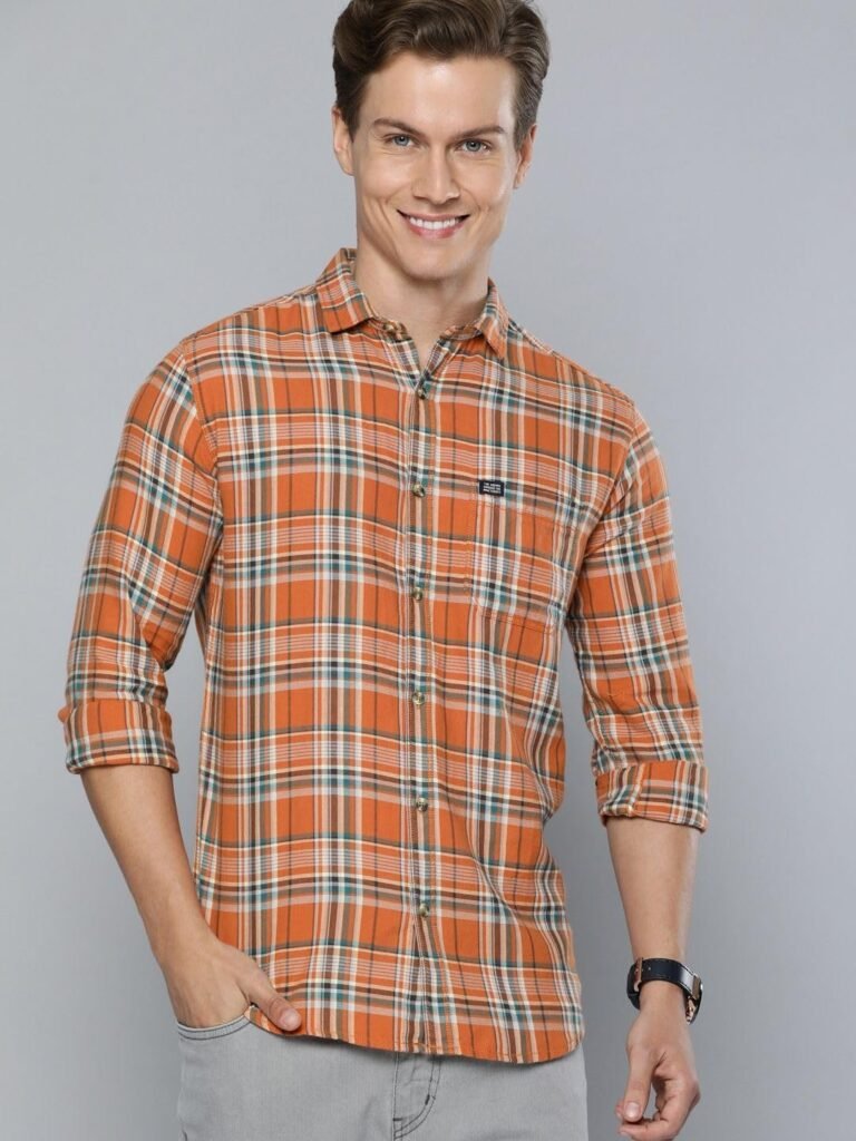 Men’s Cotton Slim Fit Checkered Full Sleeves Cutaway Collar Casual Shirt – Orange